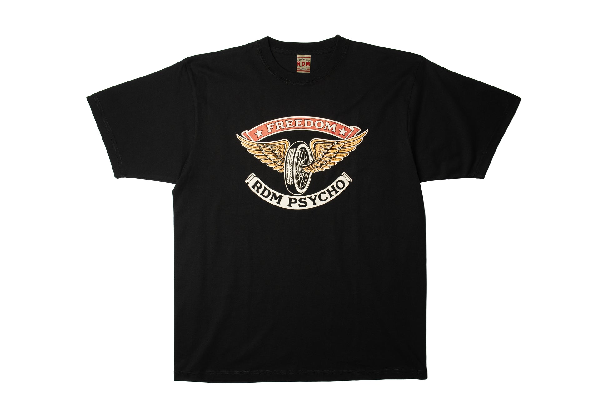 The bold red FREEDOM banner rides over a gold-inked set of wings wrapped around a spoked wheel, with RDM PSYCHO sittin’ proud underneath. Looks like something a back-alley mechanic in 70s might’ve screen-printed between rebuilds.